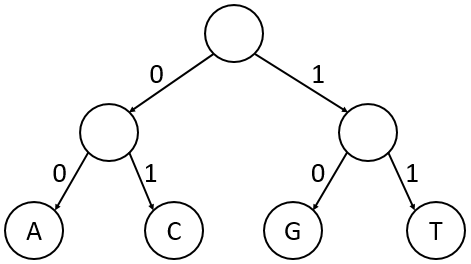 0for a left branch and1for a right branch). - Leaves: Contain the actual symbols from the original alphabet (e.g., A, C, G, T).