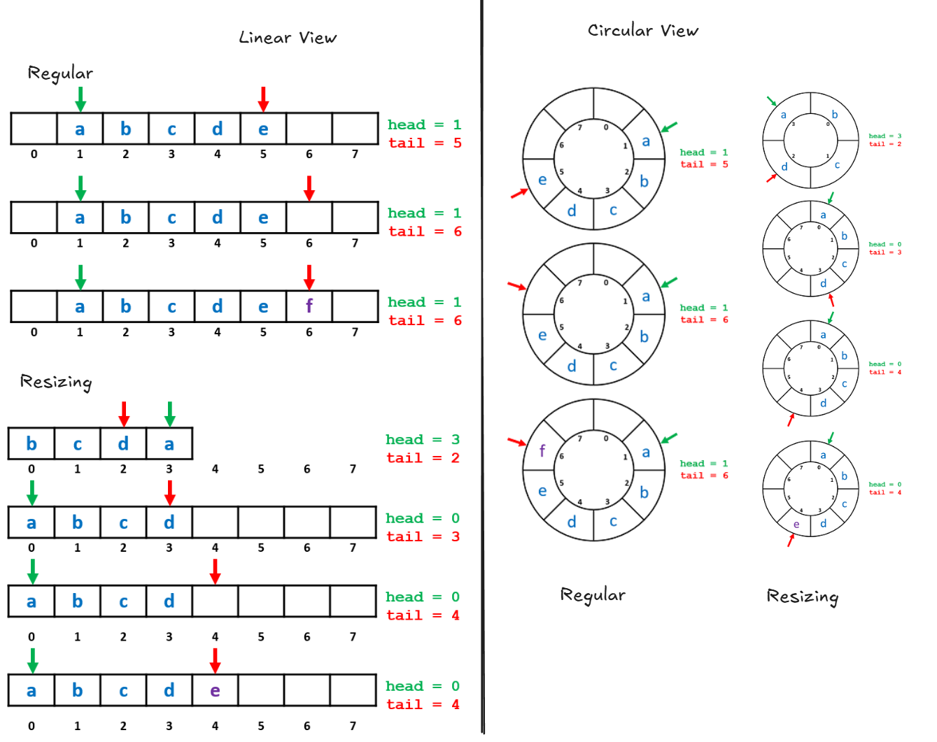 This representation shows how the data actually sits in computer memory. The head and tail indices move across the array and “wrap” back to the other side when they hit the boundaries.