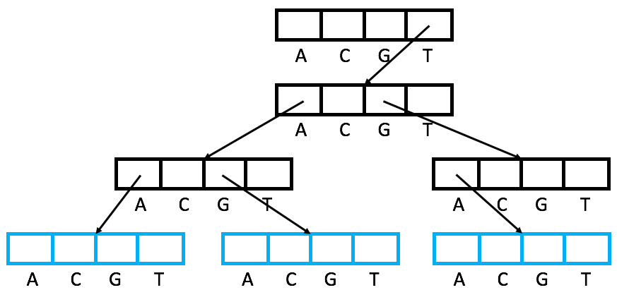 - Access: Because each character maps directly to an array index (e.g., ‘a’ 0, ‘b’ 1), the time to follow an edge is constant.