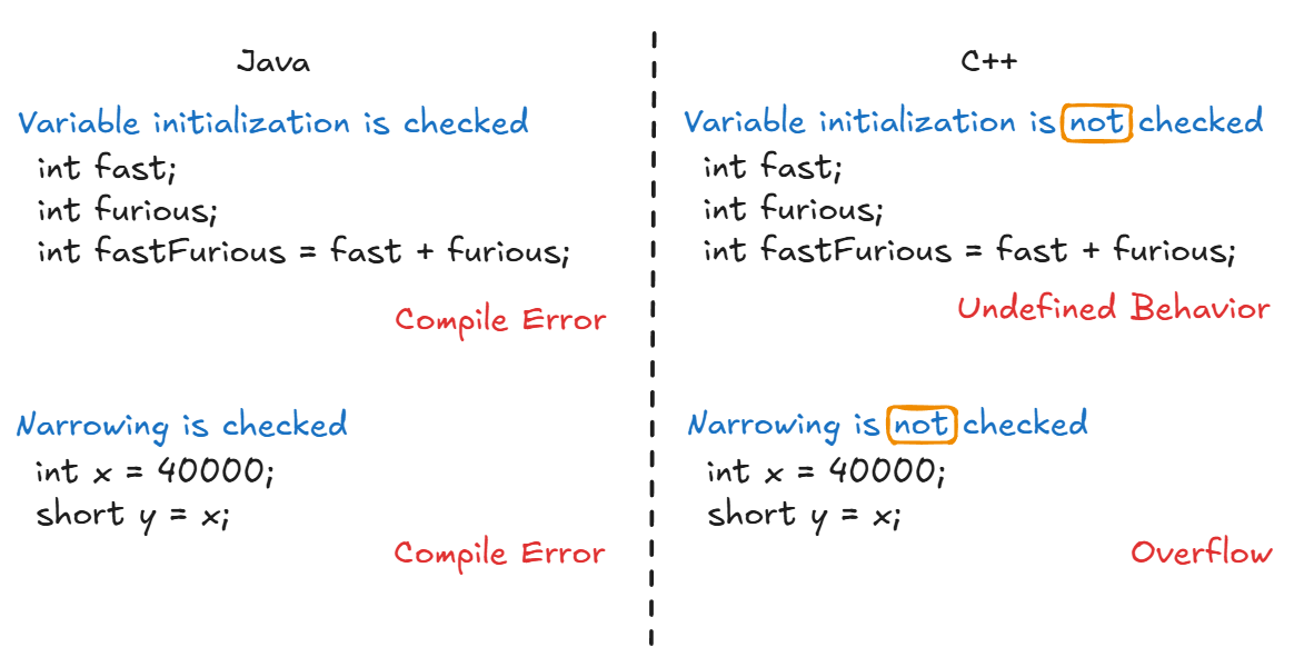 Safety Warning: Unlike Java, C++ does not check bounds. Accessing v[100] in a size-10 vector will not throw an exception; it will access garbage memory and potentially crash.