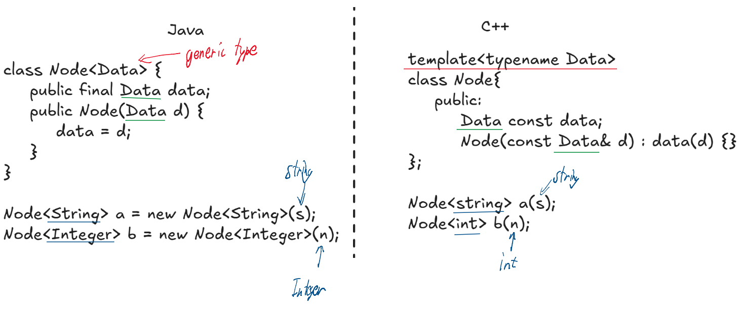 Primitives: Templates natively support int and double, whereas Java requires wrapper classes (e.g., Integer).