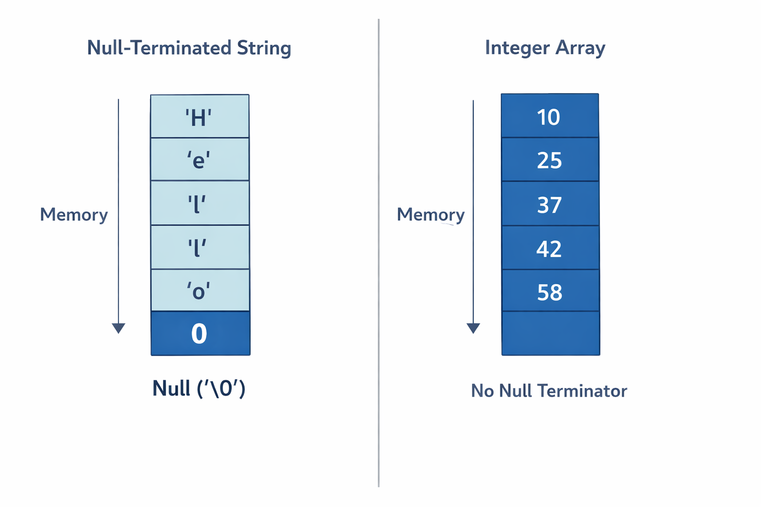 | Termination | Null-terminated (\0) | No built-in terminator |