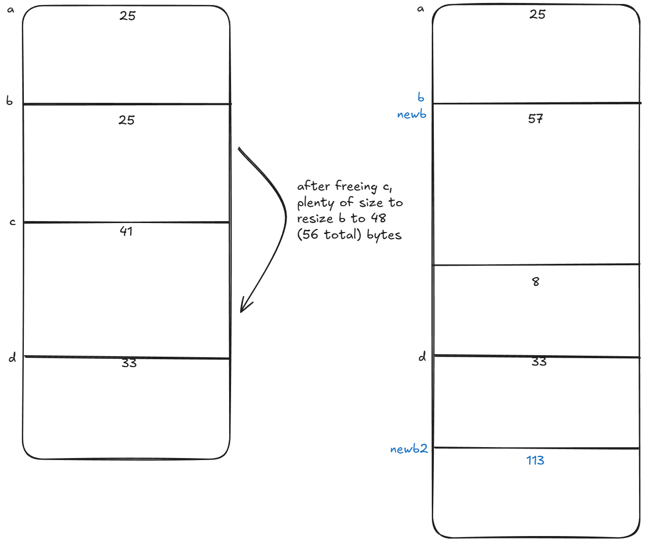 e = malloc(32); In our current implementation from Implementation of Malloc, we cannot use the freed space to store e because the individual blocks b and c do not recognize the combined space as a single usable block. b is too small, and c is too small, so e is forced to the end of the heap behind d.