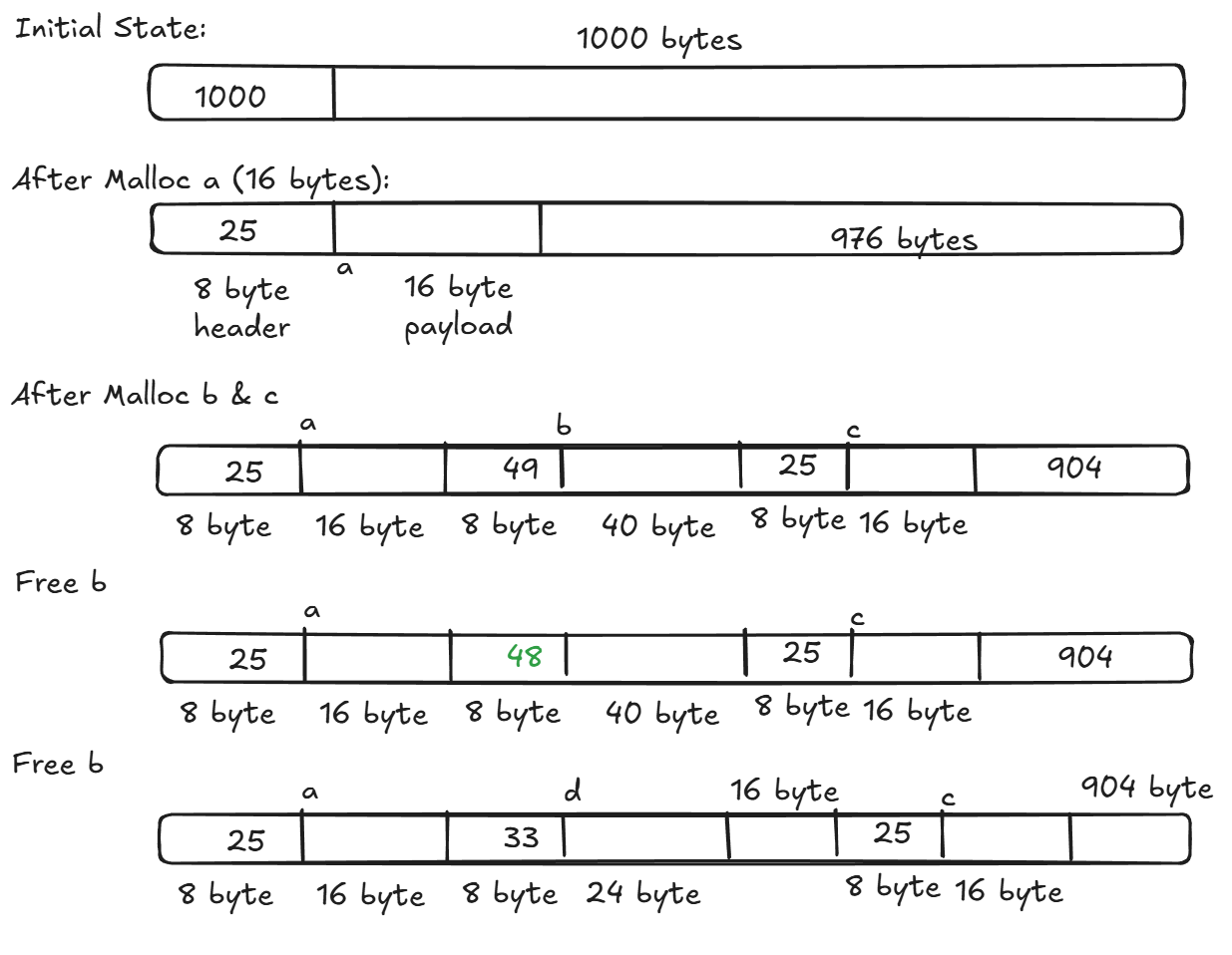 - Coalescing Heap: How the allocator uses these headers to merge adjacent free blocks.