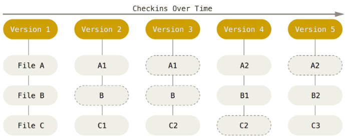Every time you commit, or save the state of your project in Git, it basically takes a picture of what all your files look like at that moment and stores a reference to that snapshot. To be efficient, if files have not changed, Git doesn’t store the file again, just a link to the previous identical file it has already stored. Git thinks about its data more like a stream of snapshots.